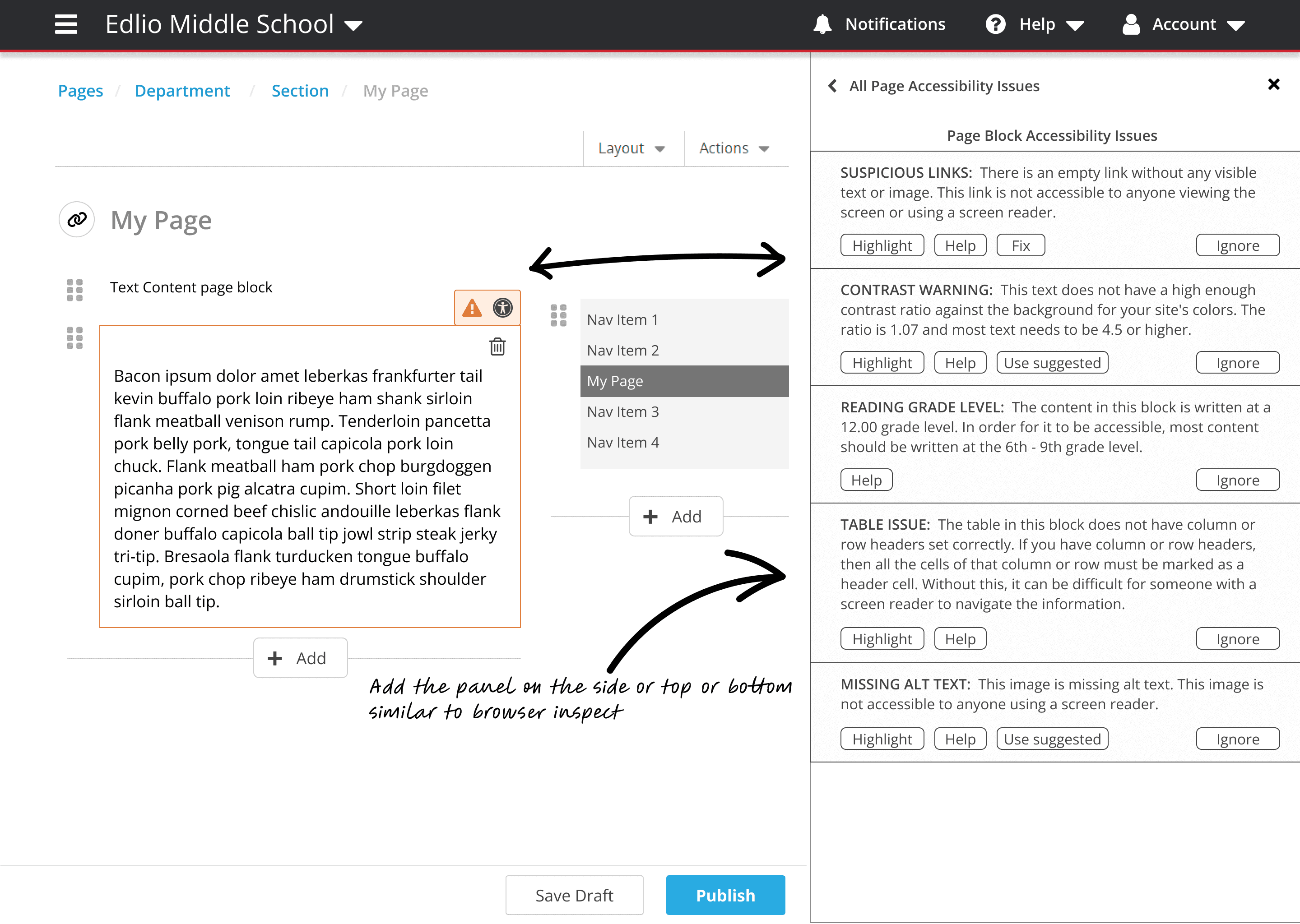 Users relied on third-party tools like Siteimprove and WAVE to check if their websites met accessibility standards. This resulted in a fragmented and frustrating experience where users would have to save or publish their contact multiple times, check for accessibility from a third party, and then fix their accessibility errors.